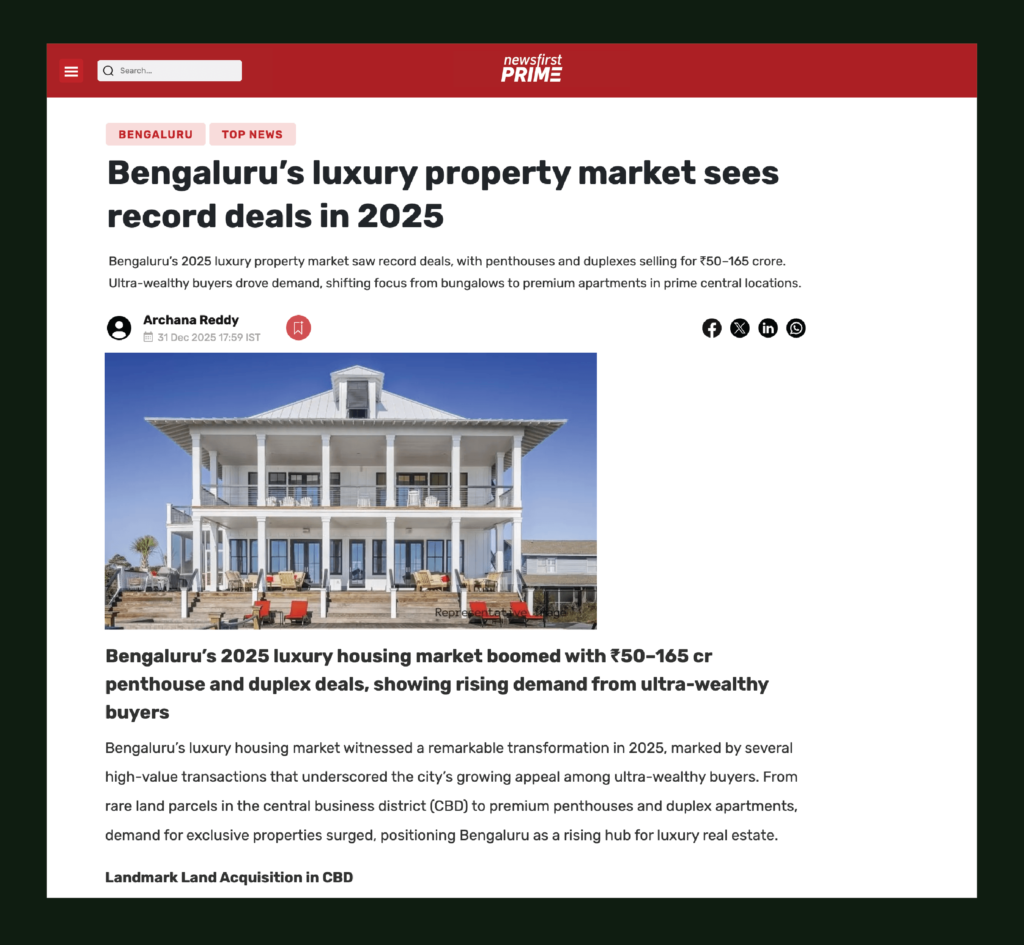 Bengaluru’s luxury housing market witnessed a remarkable transformation in 2025, marked by several high-value transactions that underscored the city’s growing appeal among ultra-wealthy buyers. From rare land parcels in the central business district (CBD) to premium penthouses and duplex apartments, demand for exclusive properties surged, positioning Bengaluru as a rising hub for luxury real estate.